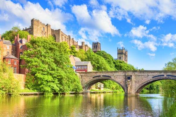 Durham Castle and Cathedral, Framwellgate Bridge spanning the River Wear, Durham, England